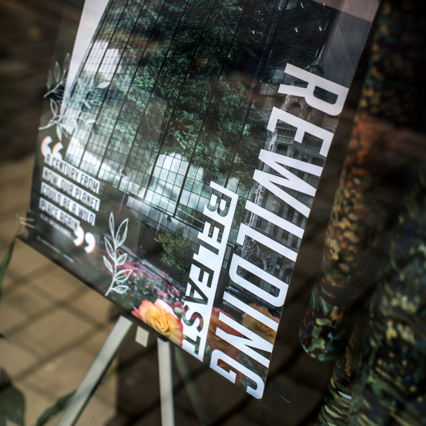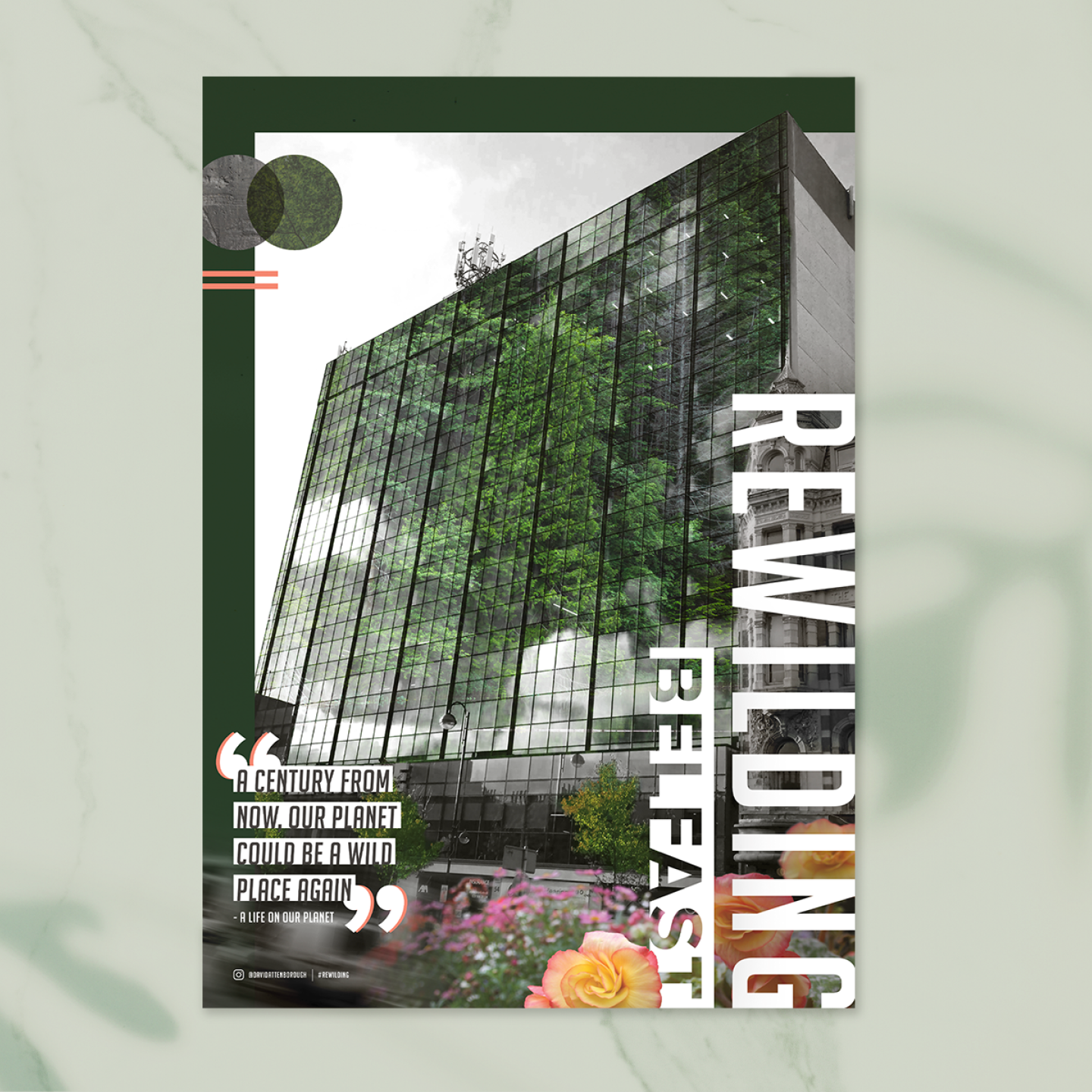 Rewilding Belfast was inspired by David Attenborough's 'A Life on Our Planet'. In this film he describes how "forests are a fundamental component of our planet's recovery" and through rewilding and using renewable energy, our cities will be "cleaner and quieter". I have visualised how this could look in Belfast, where our reflections are not only filled with grey concrete buildings, but also with lush, green trees and foliage. Through clever, sustainable design, we can #rewildbelfast to make a positive impact on our environment.