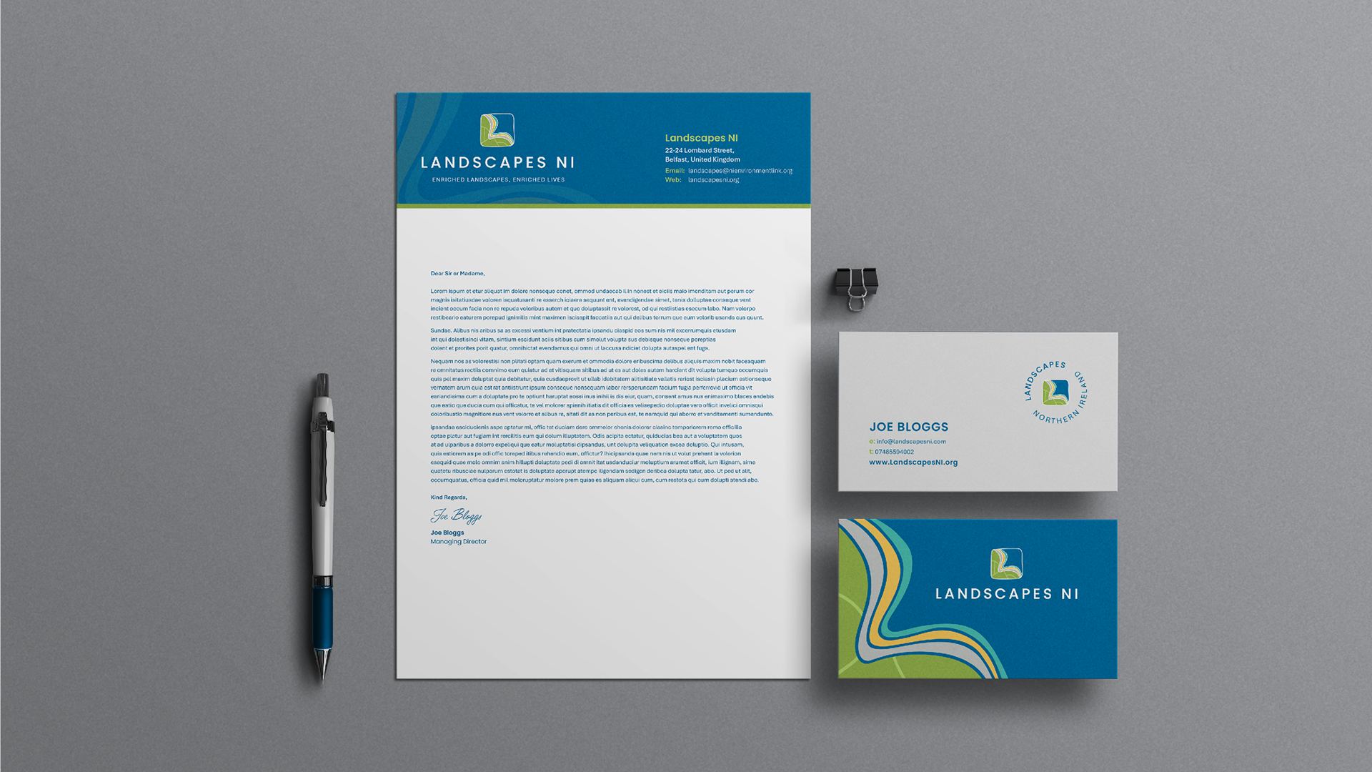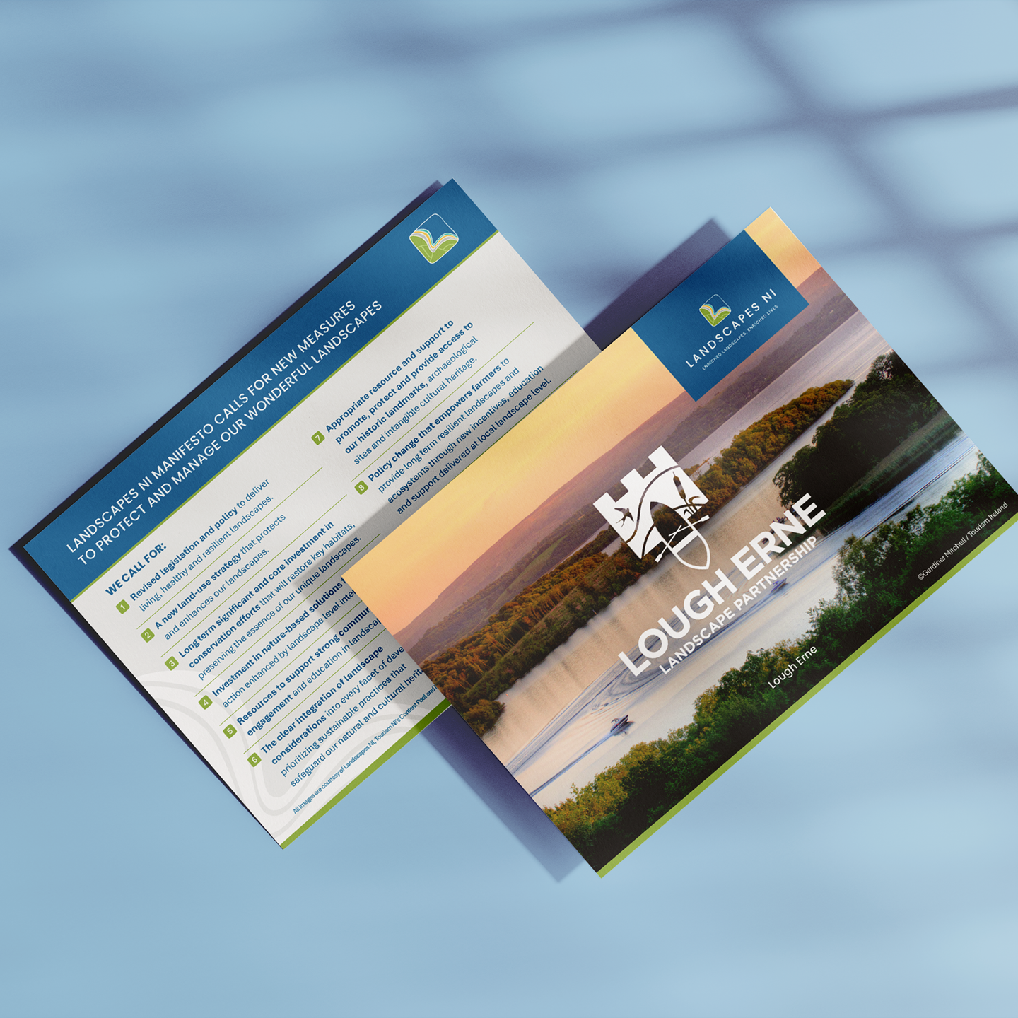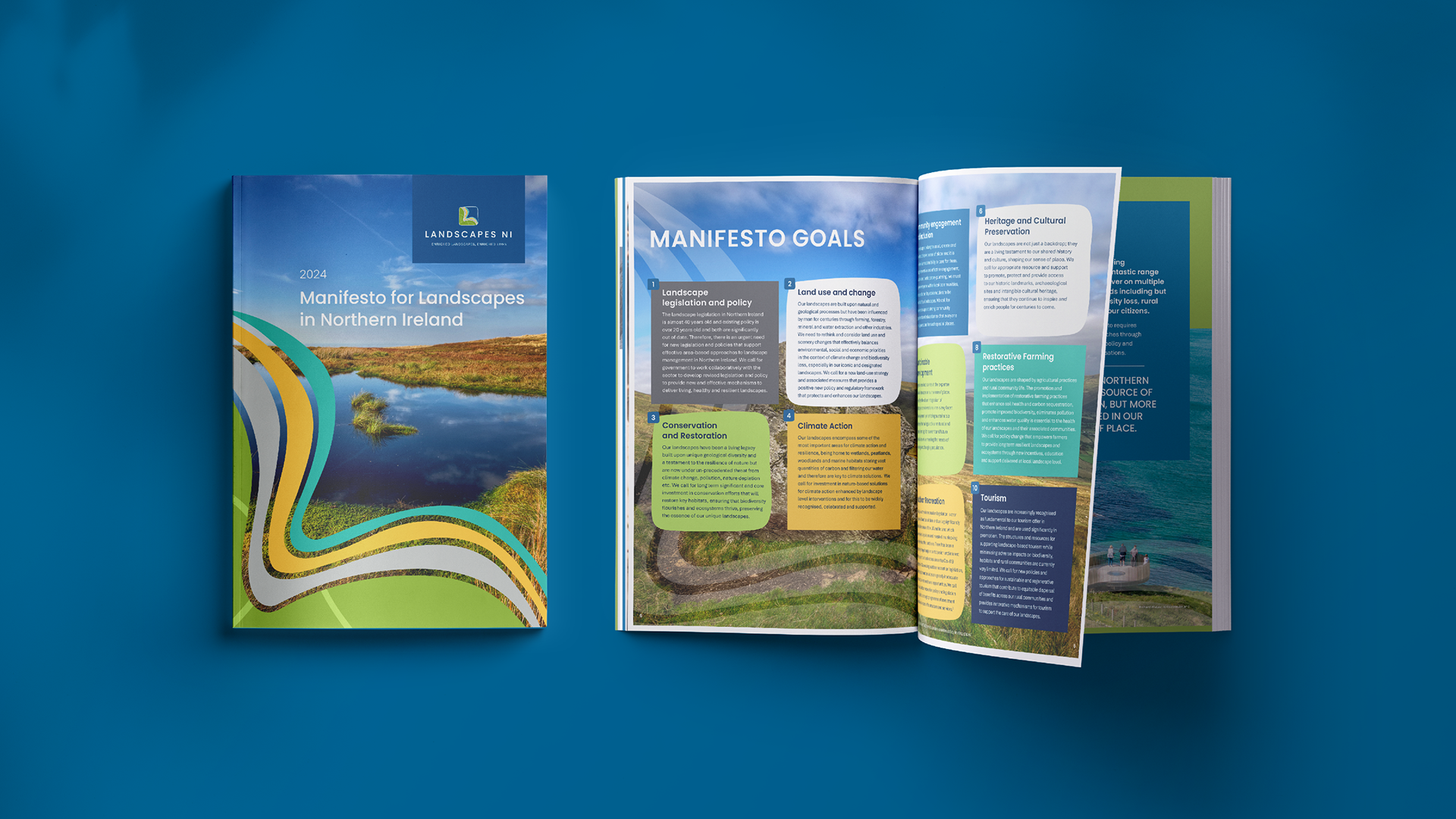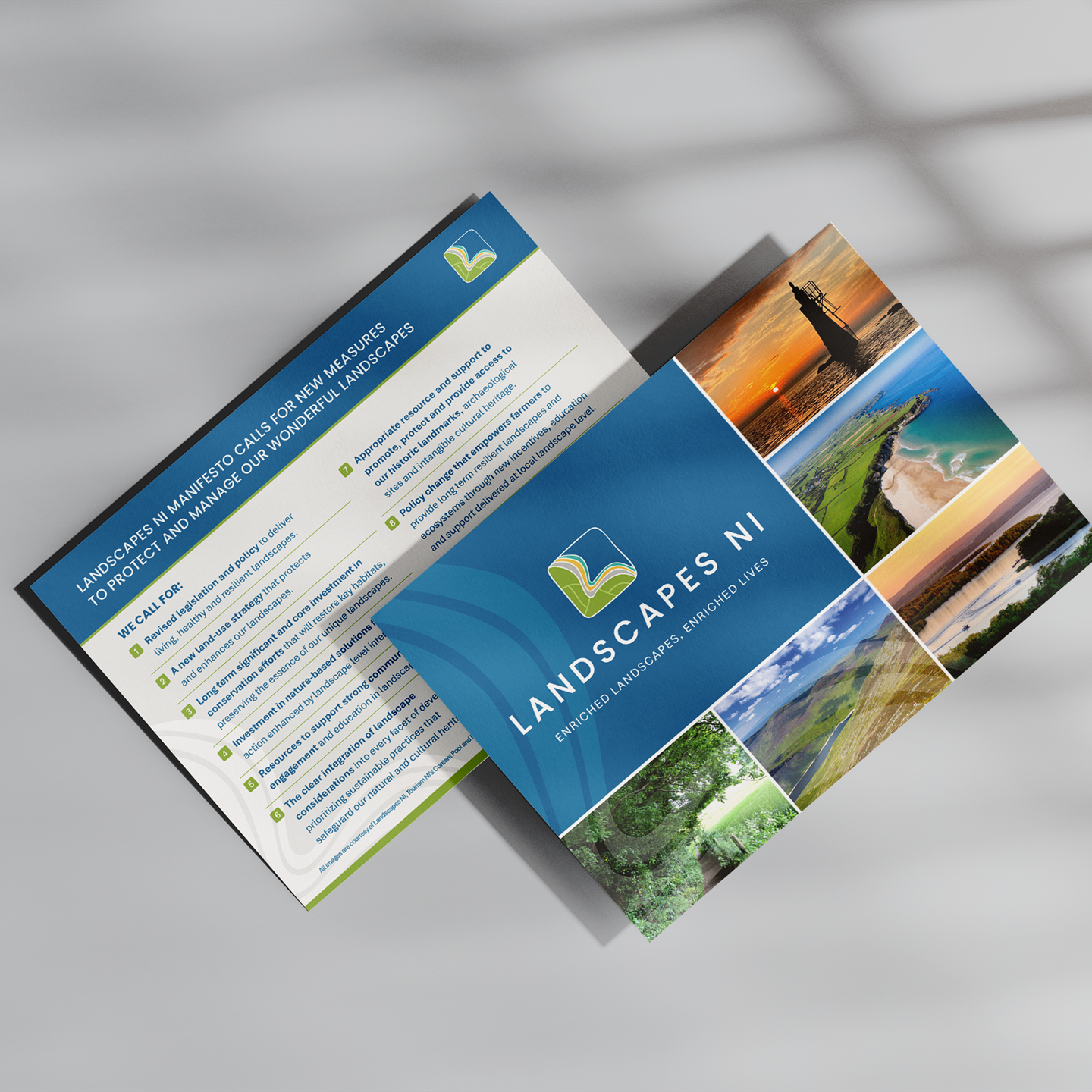 We designed the brand identity, consisting of the logo, icon, colour palette, brand guidelines and typography. We also developed templates for Powerpoint, Letterheads and reports, which were recreated in Canva so the client could repurpose the designs. We continued to work with Landscapes NI on the design of their Manifesto alongside marketing materials such as a pull up banner, postcards and infographics to support their launch.